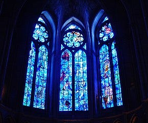 *A Reims city tour includes the Reims Cathedral of Notre Dame, A 13th century UNESCO-listed French Gothic cathedral. Some of the stain glass windows were bombed-out in WW I and were replaced with window art by Chagall yet crafted by the same 12-generation family, Simon, as the original windows. The cathedral features newer windows celebrating the monk Dom Perignon, the Champagne crafting process, the vineyard towns, and the local French Champagne industry. This is the cathedral where all the French kings were crowned.
