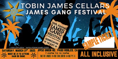· Tobin James Cellars – The “James Gang” Wine Club is California’s most popular wine club. Defined by over-the-top fun and overseas group excursions, there are lots of activities for this large wine club. I’ll be interviewing the co-owners/partners, Lance and Claire Silver, while tasting the wines from this 71-acre estate. I’ll be staying at the ranch-style Guest House on property, where I plan on absorbing some of the James Gang atmosphere. James Gang Festival 2026 is March 20-21. $181