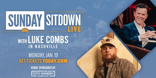 Today, in Nashville a live Sunday Sitdown takes place with Willie Geist interviewing country music superstar, multi-platinum, award-winning artist, Luke Combs. Willie will revisit Luke’s early days, unpack stories behind his biggest hits, and reflect on the moments that shaped one of country music’s most influential voices. Tickets for this live event range from $149 to $599 per person. A Grand Ole Opry member and 11x CMA, 4x ACM, 6x Billboard Music Award-winner, Luke Combs is widely respected by his peers and recently collaborated with artists such as Post Malone (“Guy For That” + “Missin’ You Like This”) and Bailey Zimmerman (“Backup Plan,” the 2025 SEC Network anthem). Currently working on new music, Combs released The Prequel earlier last fall, a 3-song collection featuring “My Kinda Saturday Night,” “15 Minutes” and “Days Like These,” as well as his current single, “Back in the Saddle.”