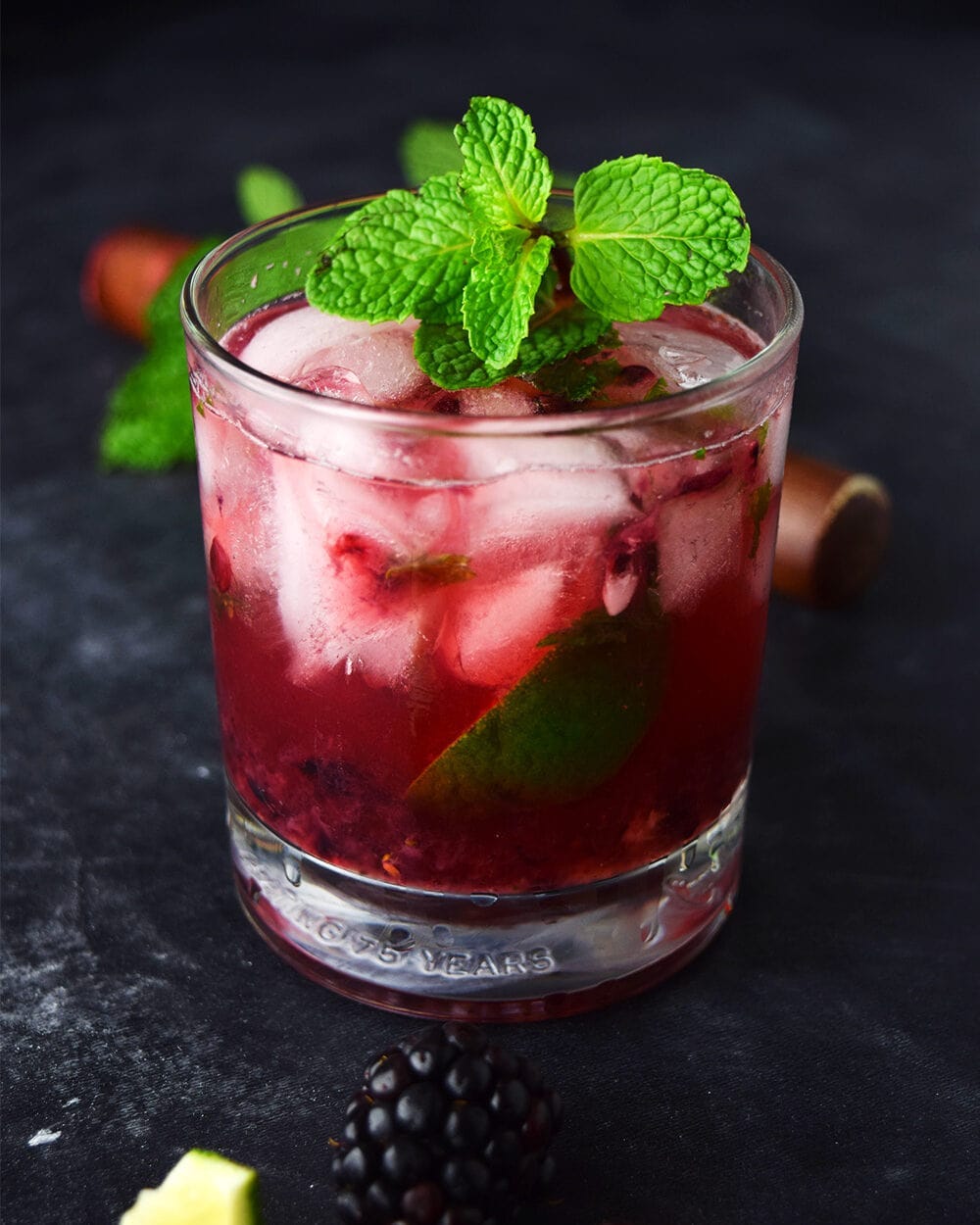 Instructions: Muddle blackberries and lemon into cocktail tin, add muddled mint and throw in tin. Add rest of ingredients with ice, shake and dump into glass.