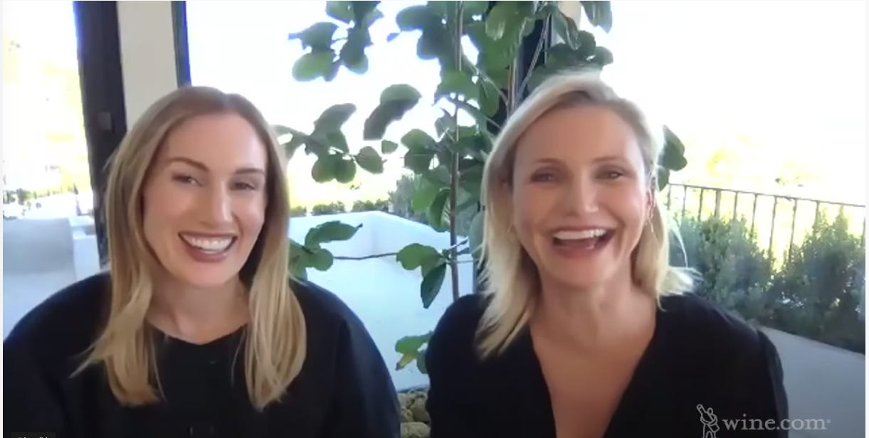 Caption: Cameron Diaz and Katherine Powers discuss Avaline Wines on a Virtual tasting hosted by Wine.com - See my Next Post on The Best Virtual Wine Tastings in 2020.