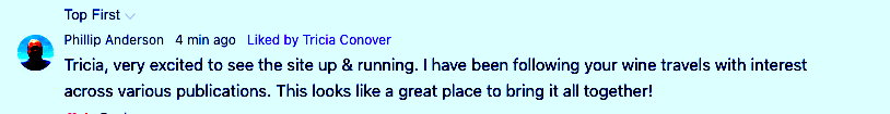 Tricia, very excited to see the site up & running. I have been following your wine travels with interest across various publications. This looks like a great place to bring it all together!